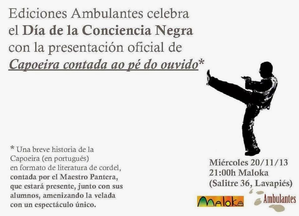 Dia 20 de novembro se comemora o dia da Consciência Negra no Brasil. Um dos personagens mais emblemáticos é o Zumbi. Para comemorar a influência da cultura africana, a luta de Zumbi pela libertação dos escravos e a arte marcial que transformou-se em símbolo da resistência negra à escravidão no Brasil, faremos uma Festa-Apresentação do cordel "Capoeira contada ao pé do ouvido". Um cordel escrito em português baseado em uma entrevista realizada com o carioca Mestre Pantera. Uma síntese da história da capoeira e desse grande Mestre que, com muito orgulho e muita garra, foi inspirado pelo grande negro Zumbi. A festa não poderia ter um lugar melhor, vai ser no bar brasileiro MALOKA.